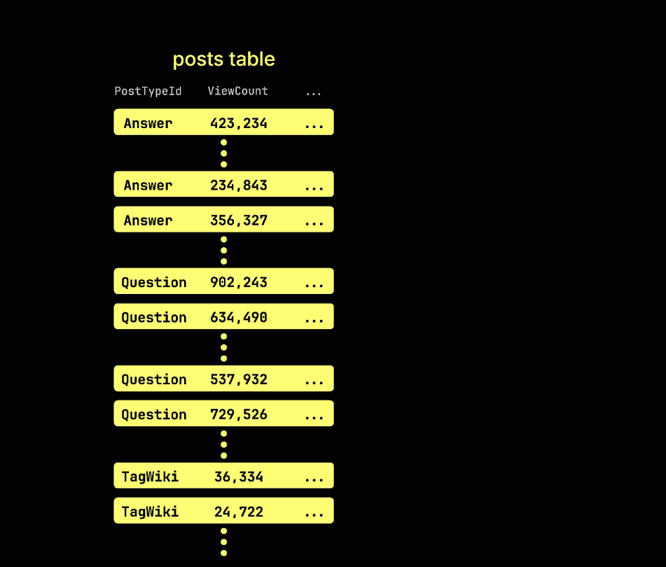 Рассмотрим следующую оптимизированную таблицу. Она содержит данные Stack Overflow с одной строкой на пост.