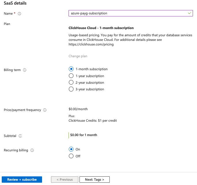 1. Обратите внимание, что на этом этапе вы подписались на подписку Azure ClickHouse Cloud, но еще не настроили свою учетную запись на ClickHouse Cloud. Следующие шаги необходимы и критически важны для того, чтобы ClickHouse Cloud смог связать вашу подписку Azure, чтобы выставление счетов происходило корректно через Azure Marketplace.