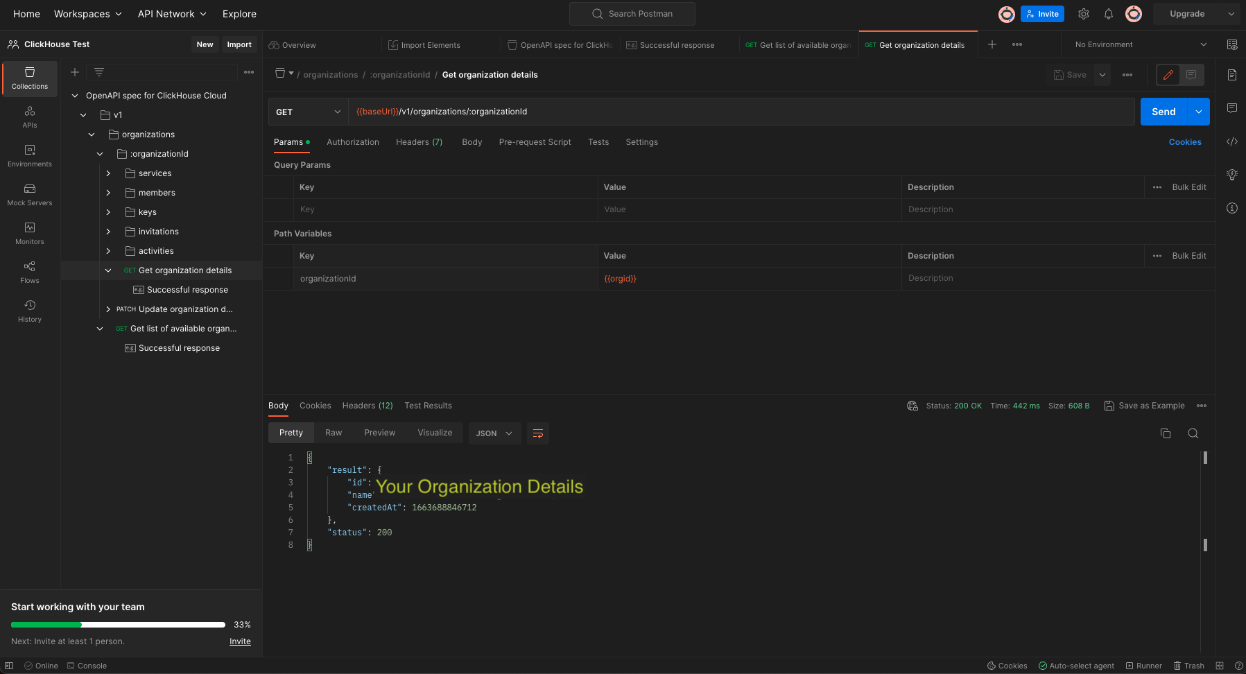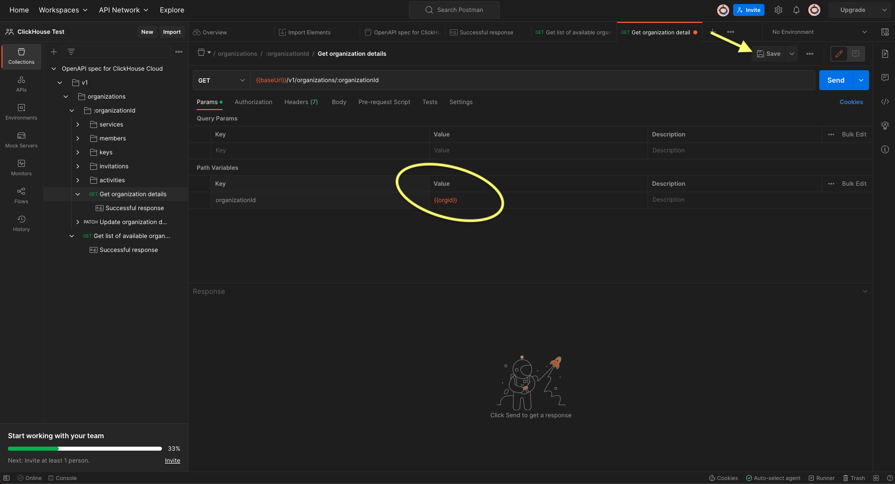 • В разделе "Спецификация OpenAPI для ClickHouse Cloud" разверните папку > V1 > organizations