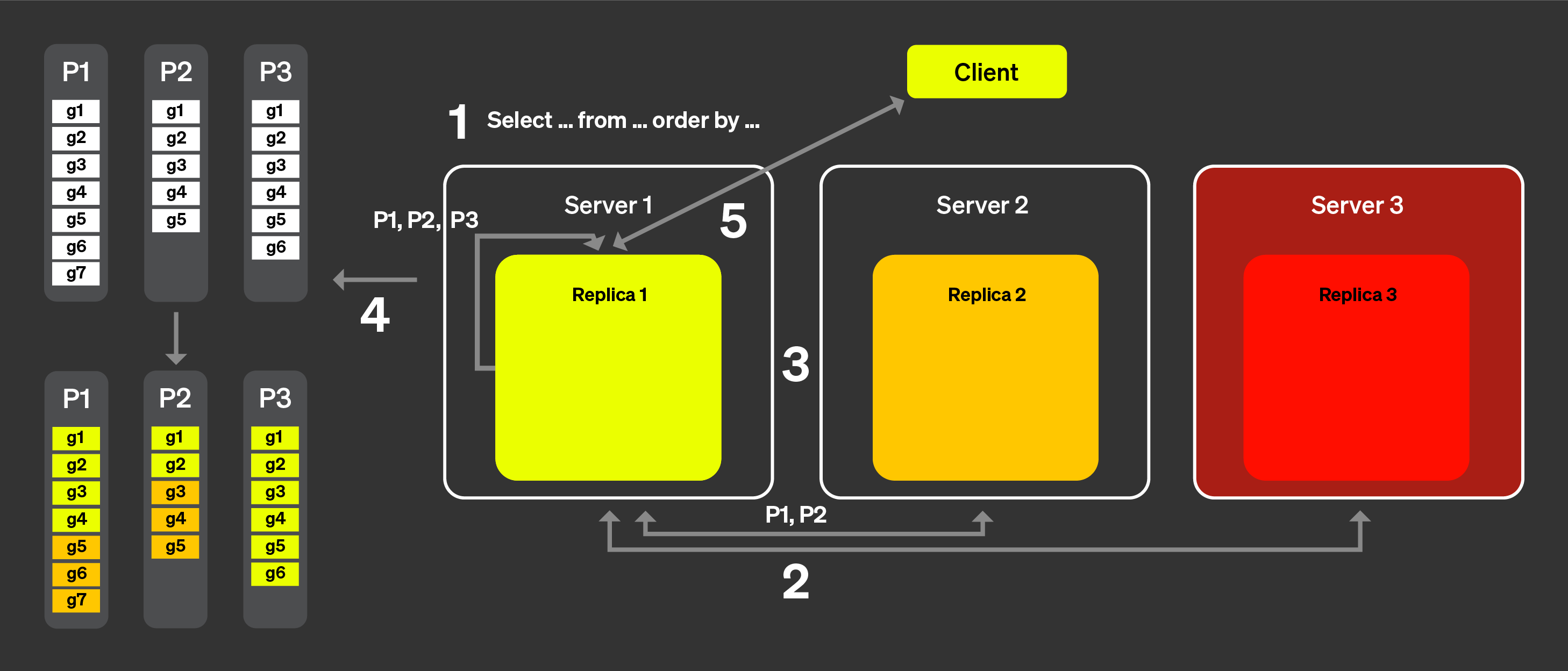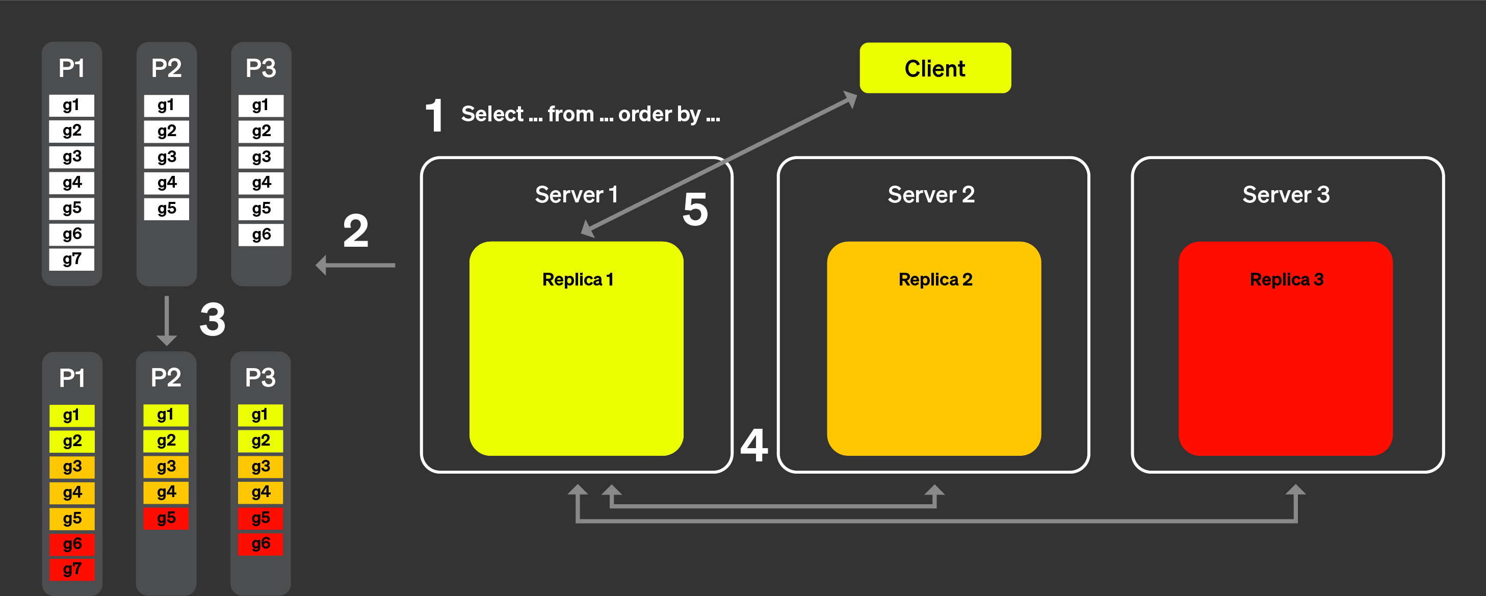 4. После того как каждая реплика обработала запрос на своем подмножестве гранул и объединяемое состояние было отправлено обратно координатору, координатор объединяет результаты и ответ отправляется клиенту.
