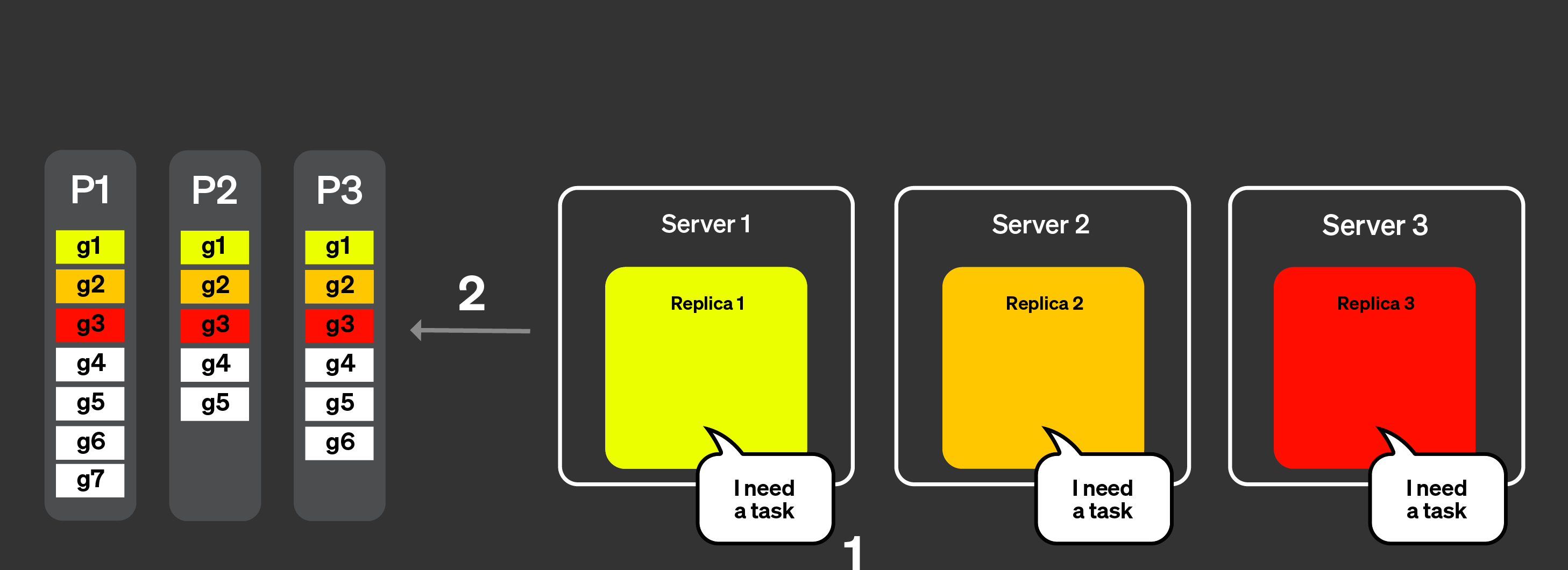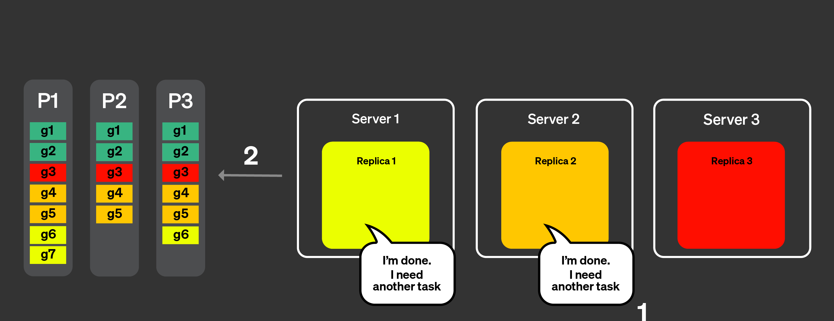 1. Реплики 1 и 2 могут очень быстро закончить свою задачу. Они запросят еще одну задачу у координатора.
