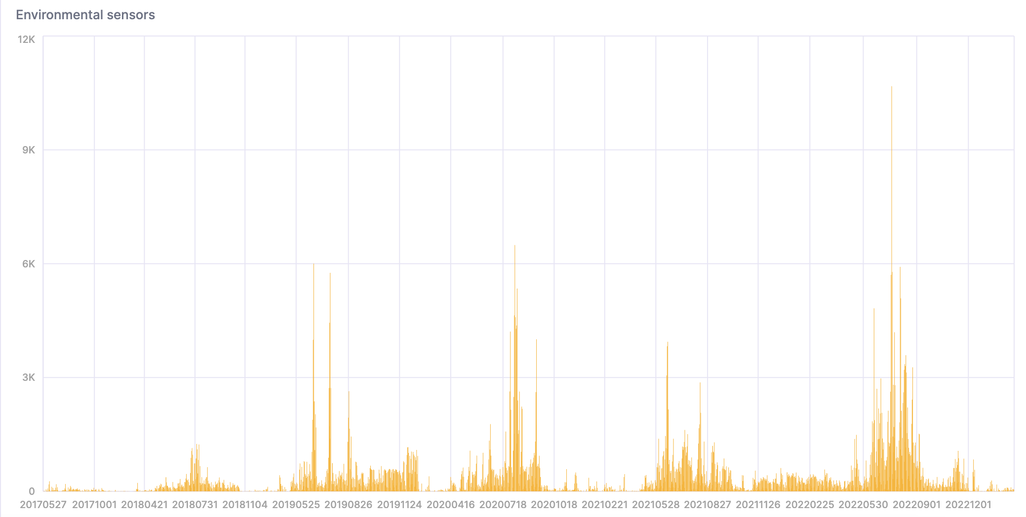 - Давайте проанализируем данные теперь, когда они находятся в ClickHouse. Обратите внимание, что количество данных увеличивается с течением времени по мере развертывания большего количества датчиков: