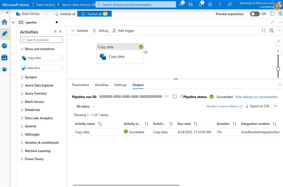 5. Нажмите Отладка в верхней части холста, чтобы запустить конвейер. После короткого ожидания активность будет поставлена в очередь и выполнена. Если все настроено корректно, задача должна завершиться со статусом Успех.