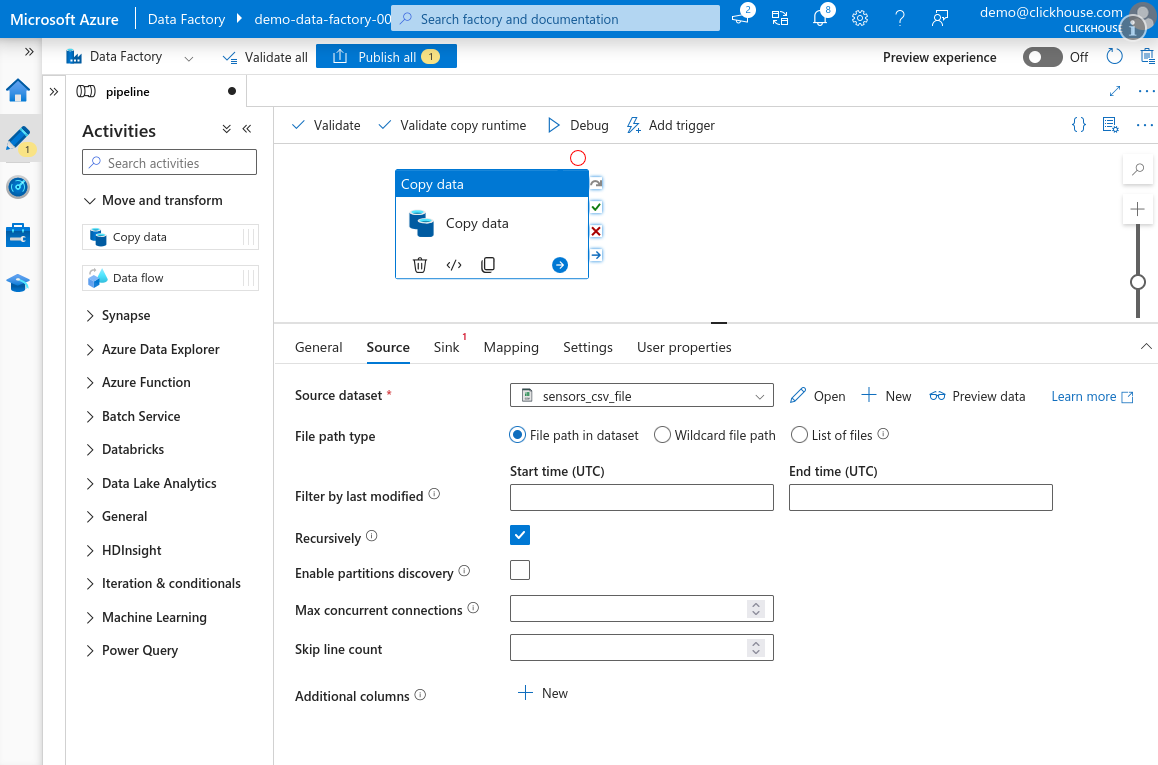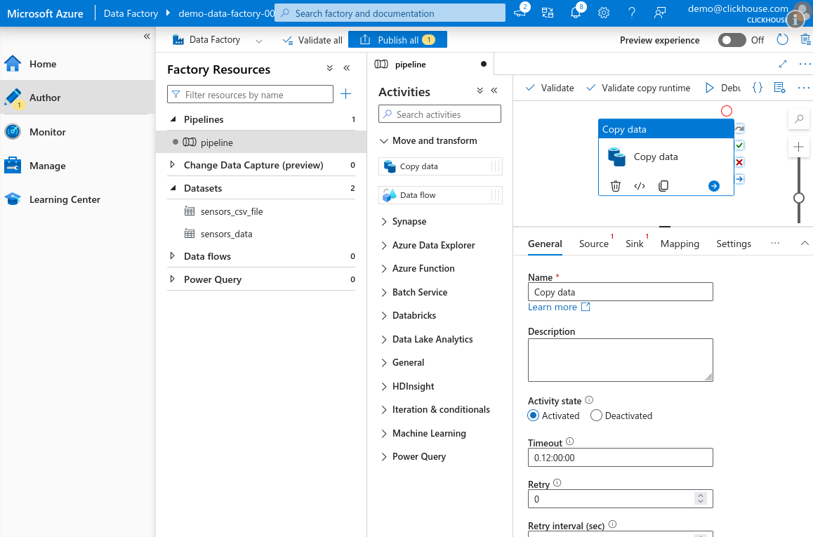 Теперь, когда мы настроили как входные, так и выходные наборы данных, мы можем настроить активность Копирование Данных для передачи данных из нашего примера набора данных в таблицу sensors в ClickHouse.