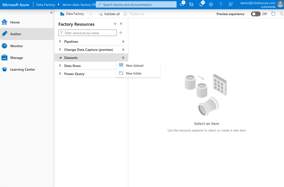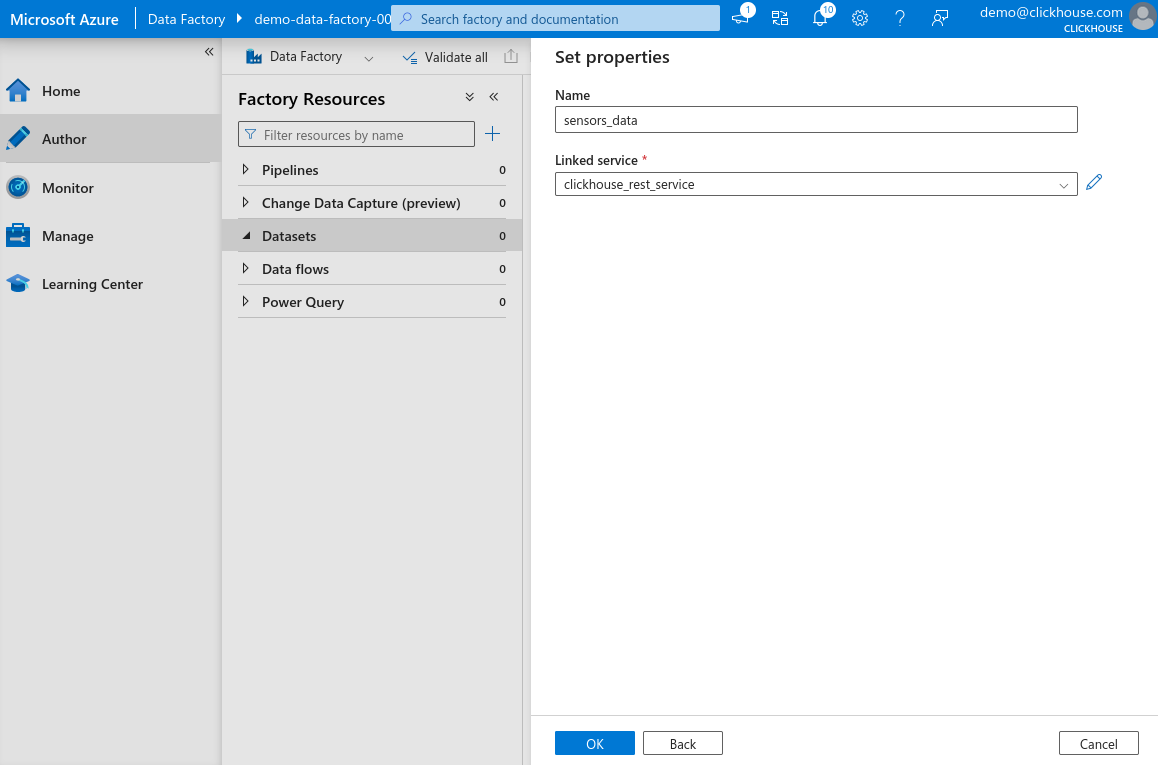 Теперь, когда у нас есть настроенная связанная служба для HTTP интерфейса ClickHouse, мы можем создать набор данных, который Azure Data Factory будет использовать для отправки данных в ClickHouse.