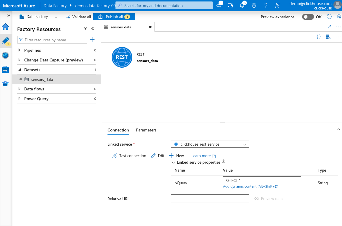 Теперь, когда мы сделали ClickHouse похожим на REST конечный пункт, пора настроить Azure Data Factory для его использования.