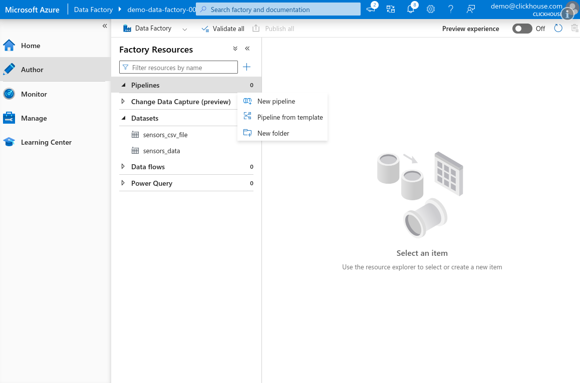 1. Откройте Azure Data Factory Studio, перейдите на вкладку Автора. В панели Ресурсы фабрики наведите курсор на Конвейер, нажмите на значок с тремя точками и выберите Новый конвейер.