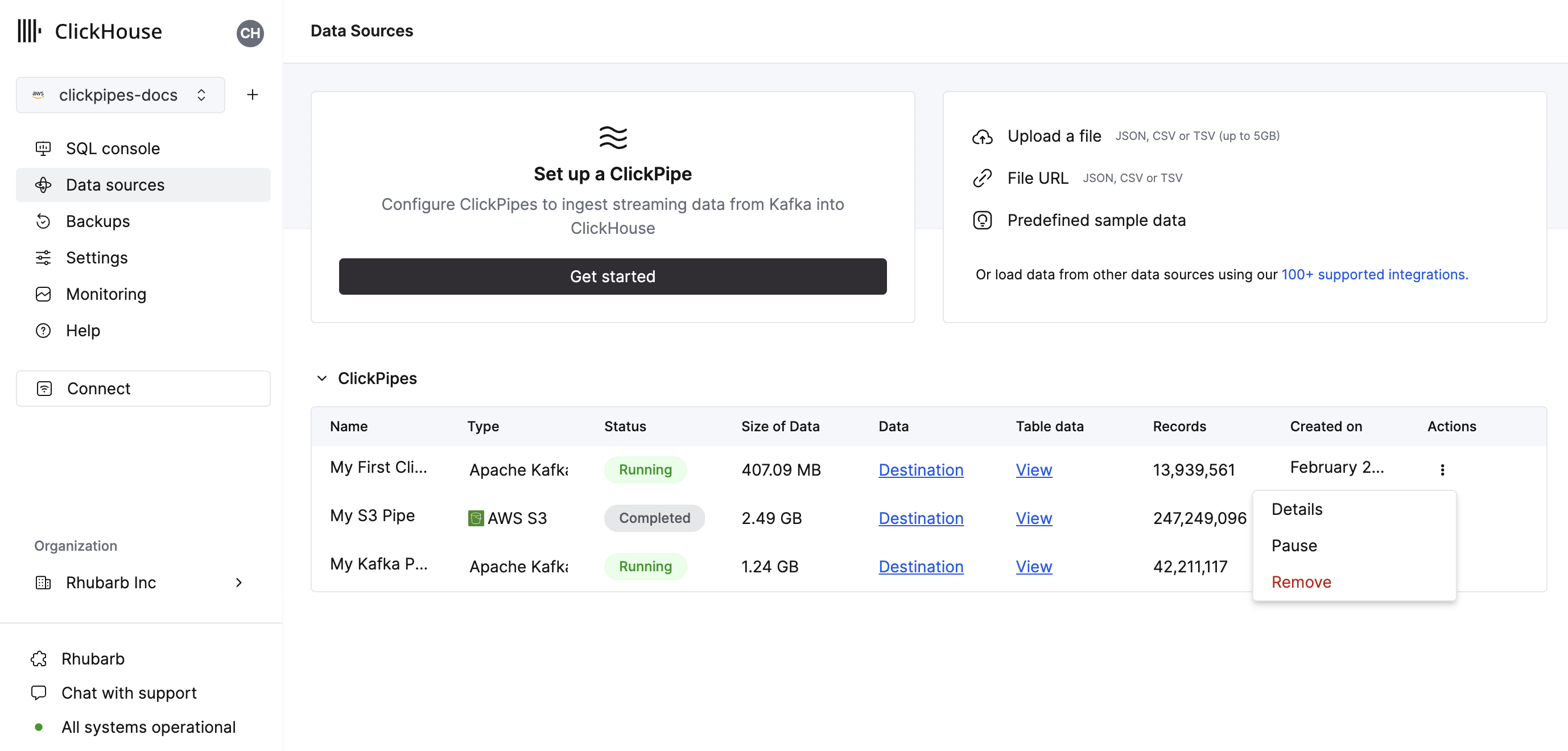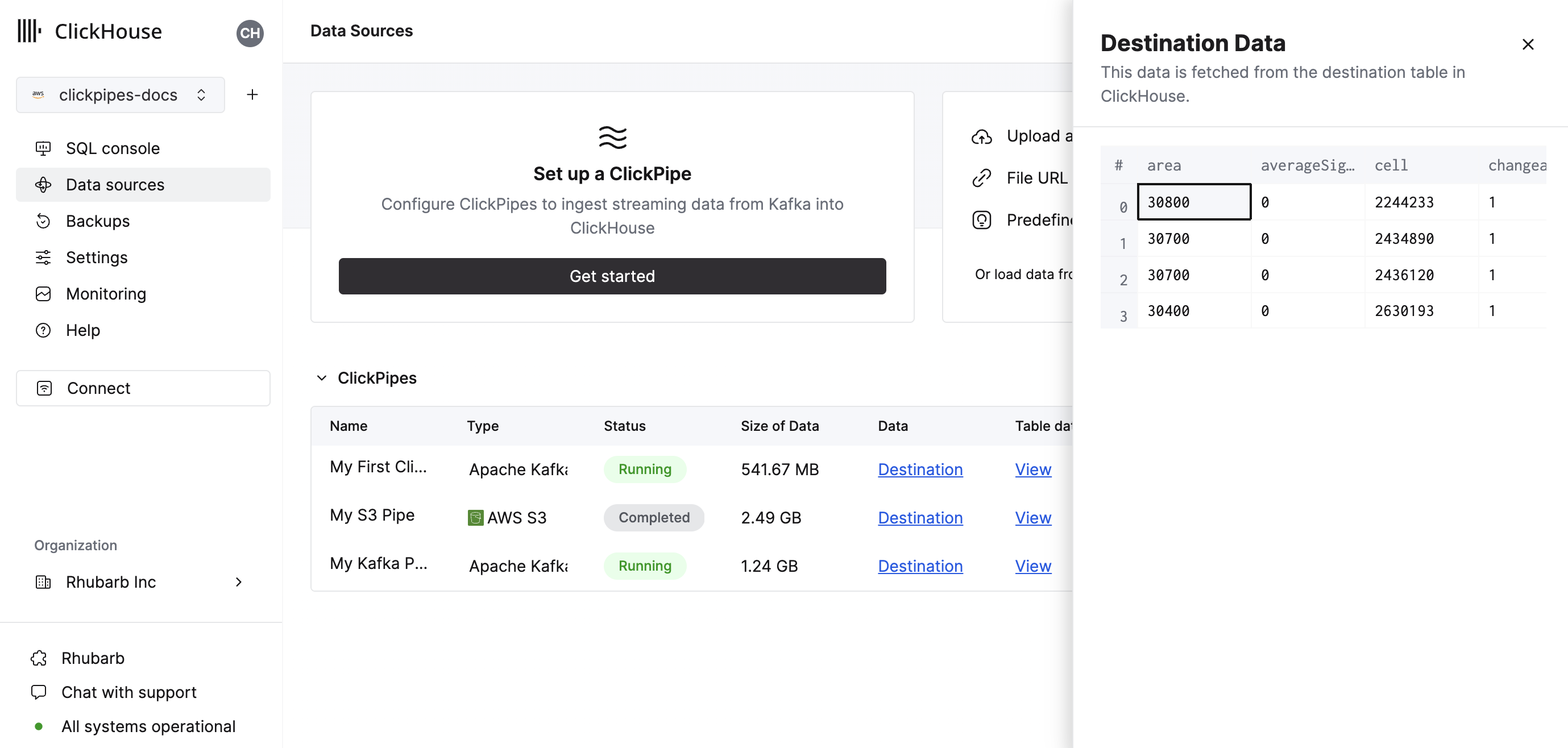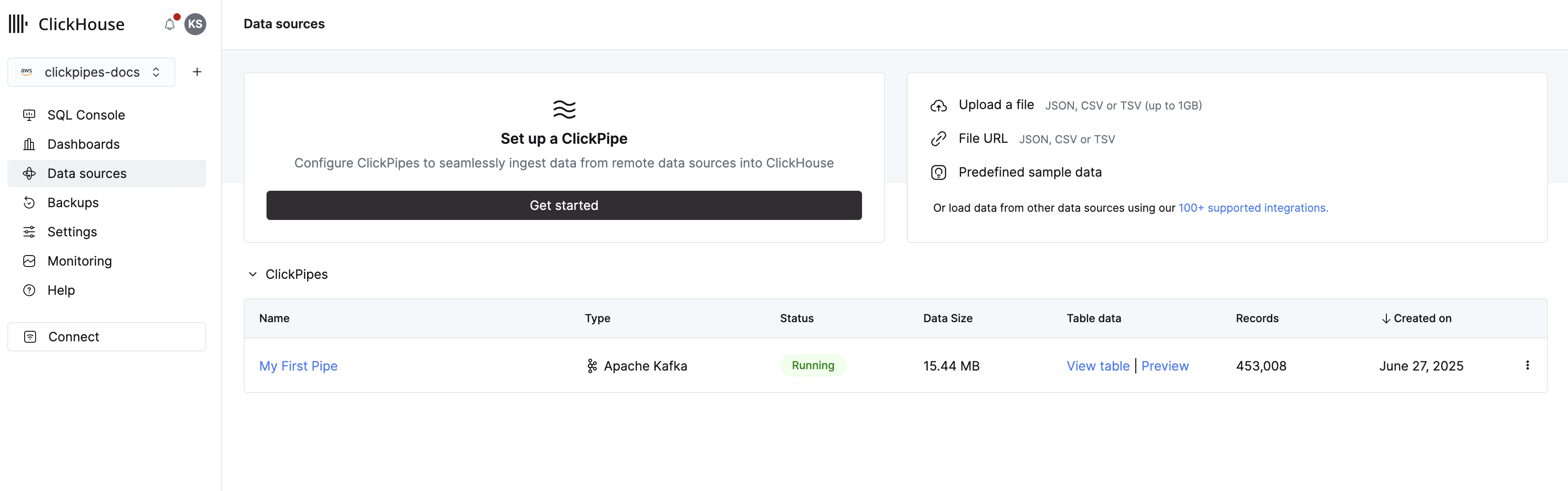 - Поздравляем! вы успешно настроили ваш первый ClickPipe. Если это потоковый ClickPipe, он будет работать непрерывно, принимая данные в реальном времени из вашего удаленного источника данных. В противном случае он обработает пакет и завершится.
