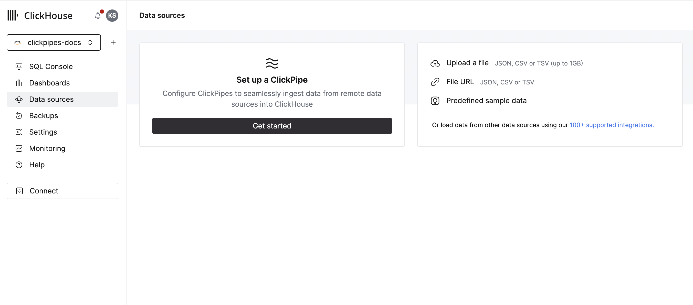 Data Sourcesв левом меню и нажмите "Настроить ClickPipe"