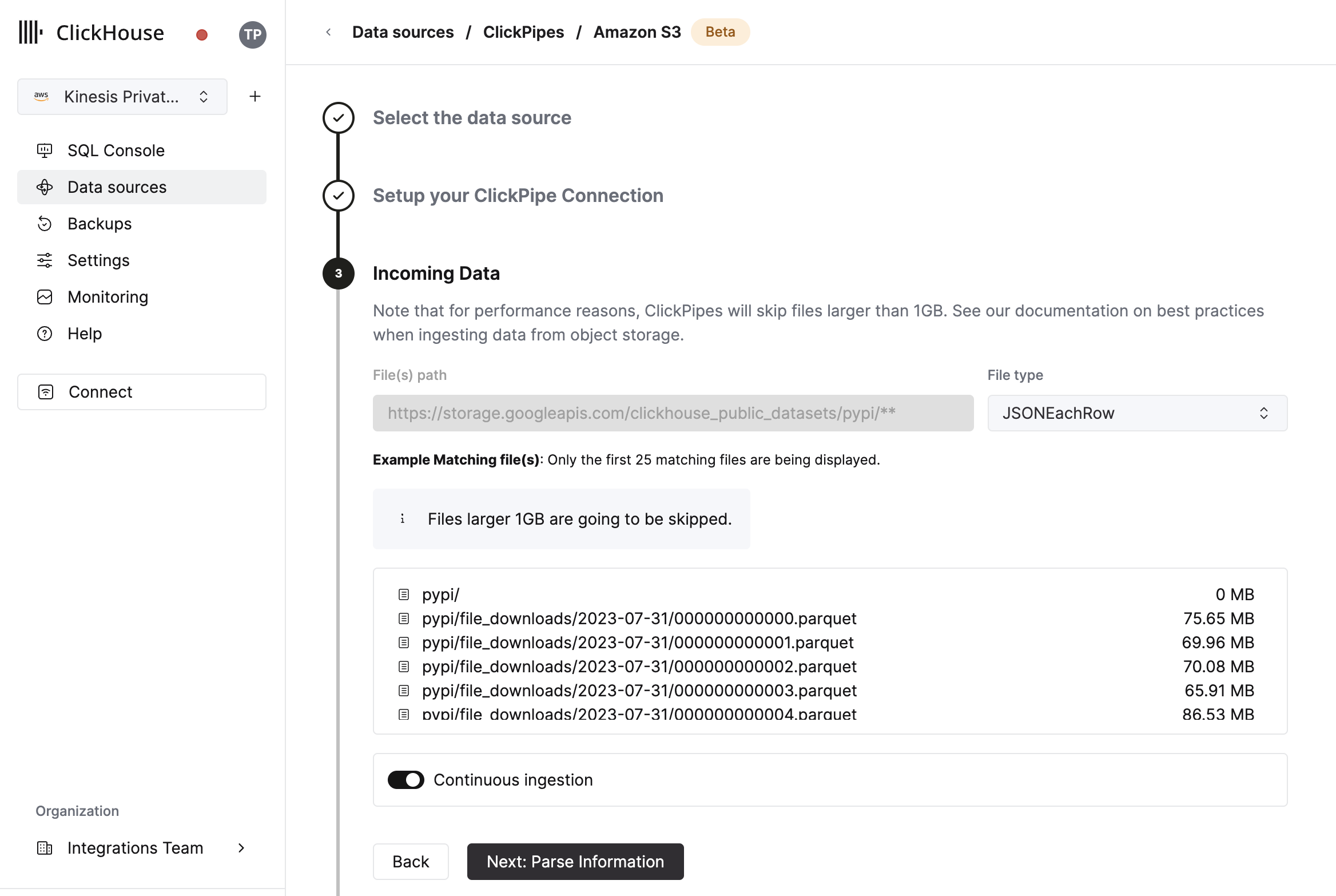 - Интерфейс отобразит список файлов в указанном ведре. Выберите формат данных (в настоящее время мы поддерживаем подсет форматов ClickHouse) и, если вы хотите включить непрерывный прием Подробнее ниже.