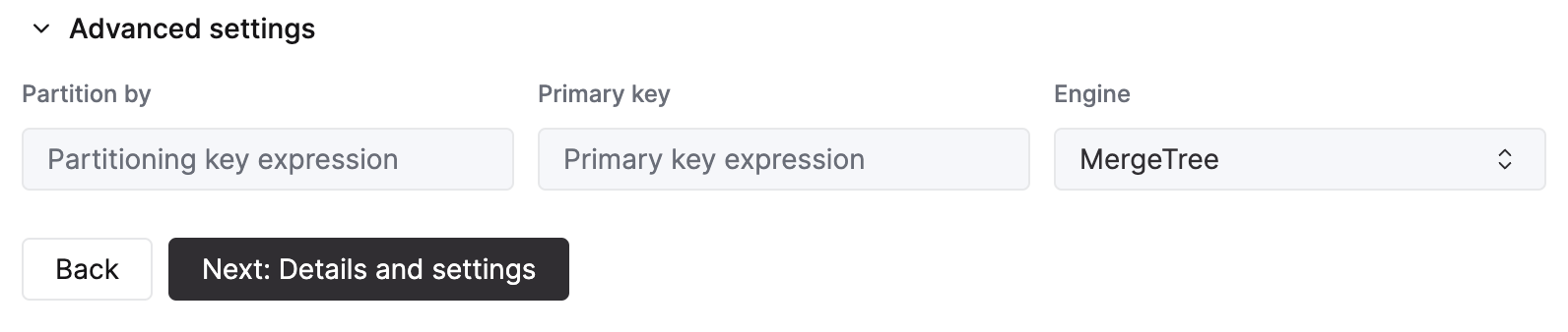 - На следующем шаге вы можете выбрать, хотите ли вы загружать данные в новую таблицу ClickHouse или использовать существующую. Следуйте инструкциям на экране, чтобы изменить имя таблицы, схему и настройки. Вы можете увидеть в реальном времени предварительный просмотр ваших изменений в образце таблицы вверху.