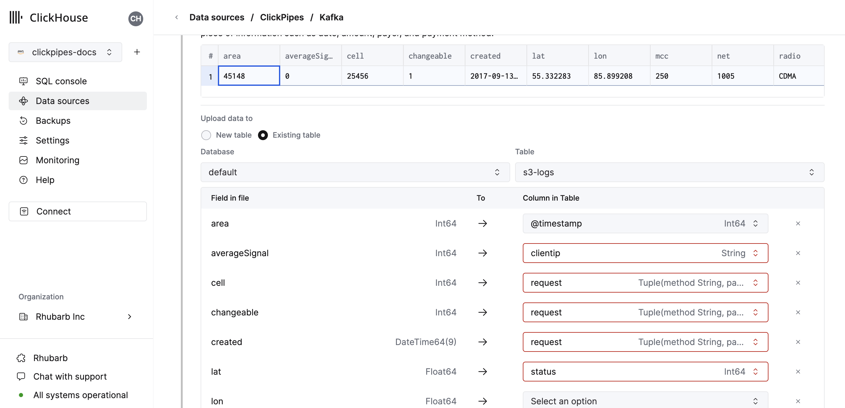 - В качестве альтернативы вы можете решить загружать данные в существующую таблицу ClickHouse. В этом случае интерфейс позволит вам сопоставить поля из источника с полями ClickHouse в выбранной целевой таблице.