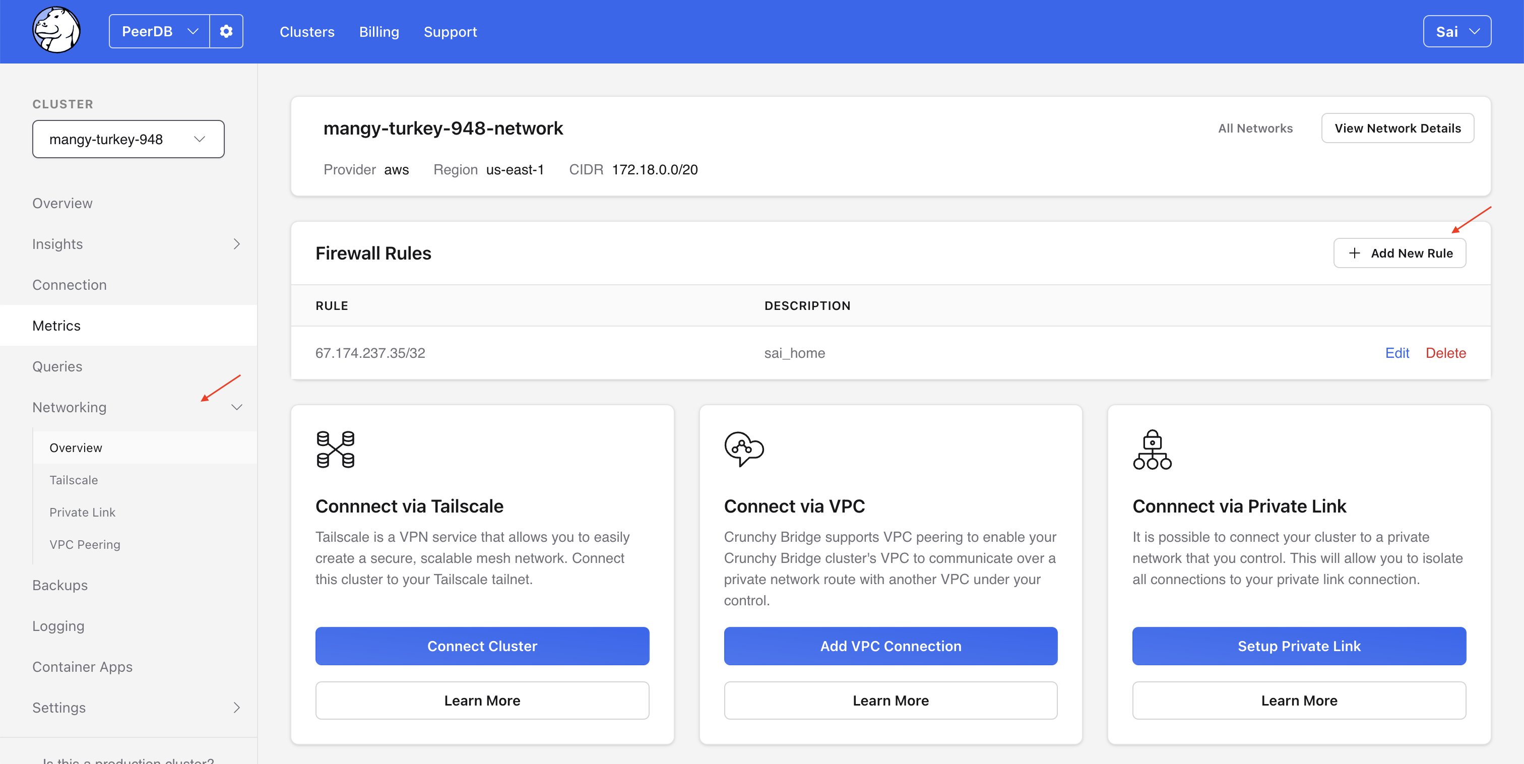 Добавьте IP-адреса ClickPipes в безопасный список, добавив правила брандмауэра в Crunchy Bridge.
