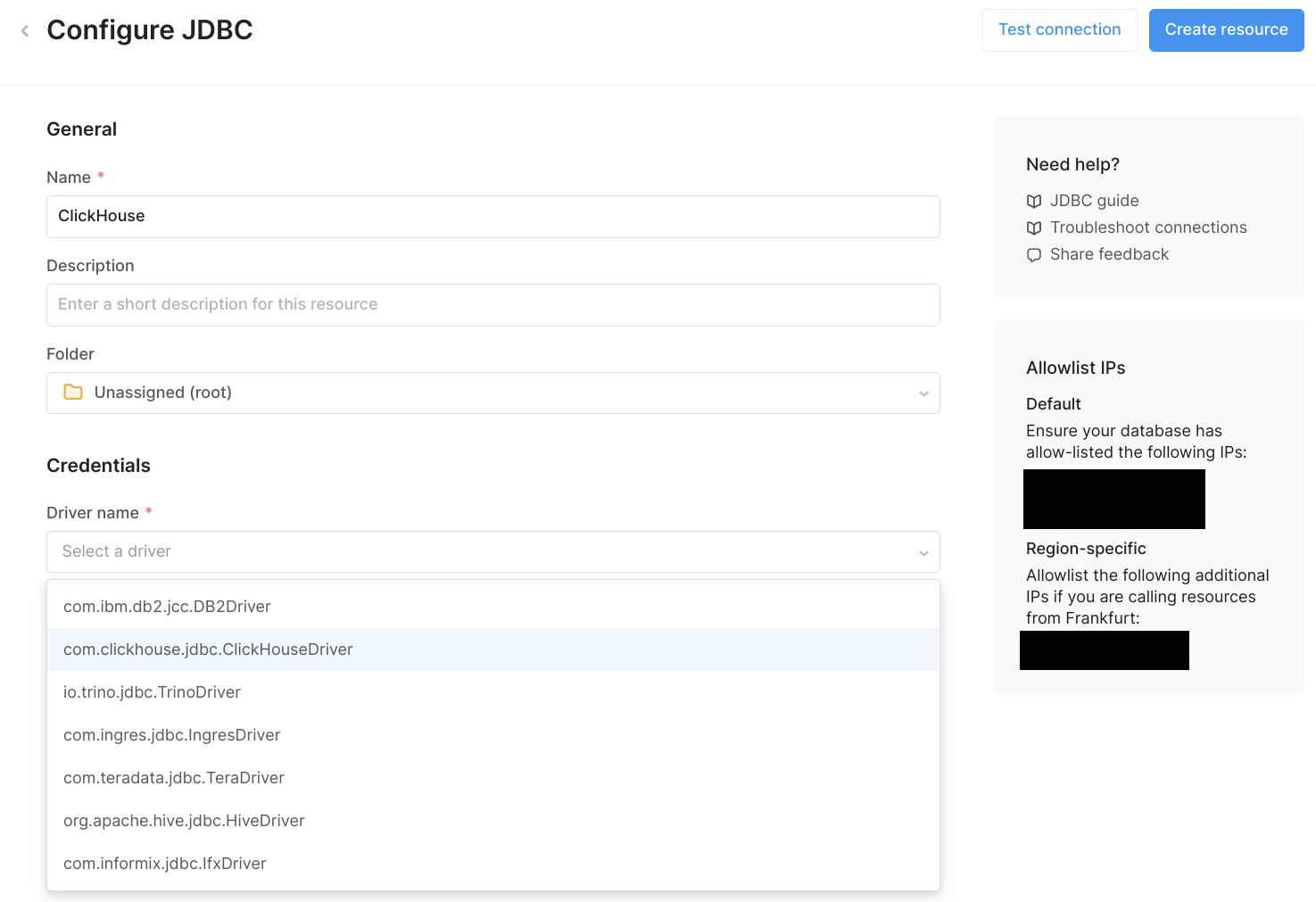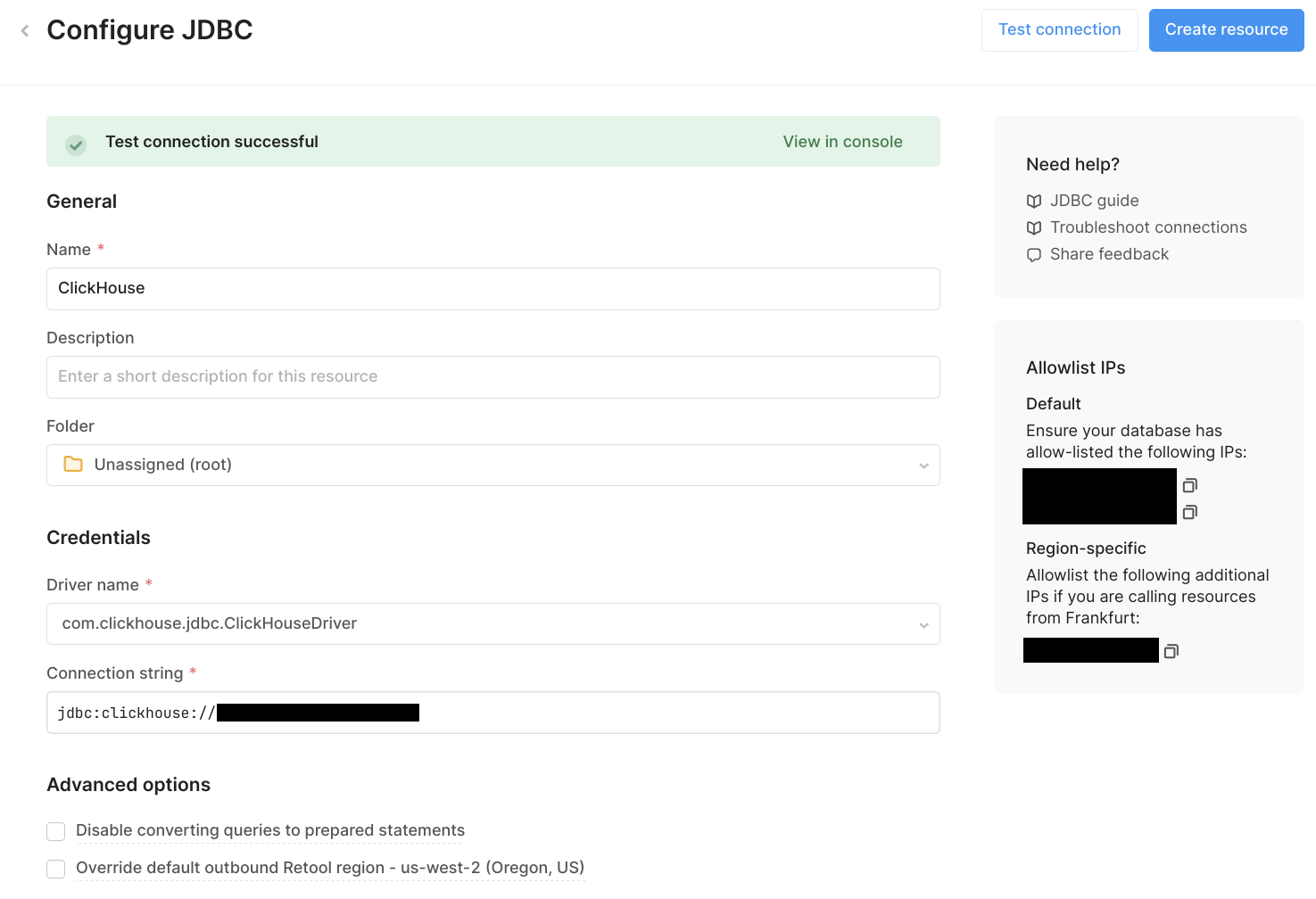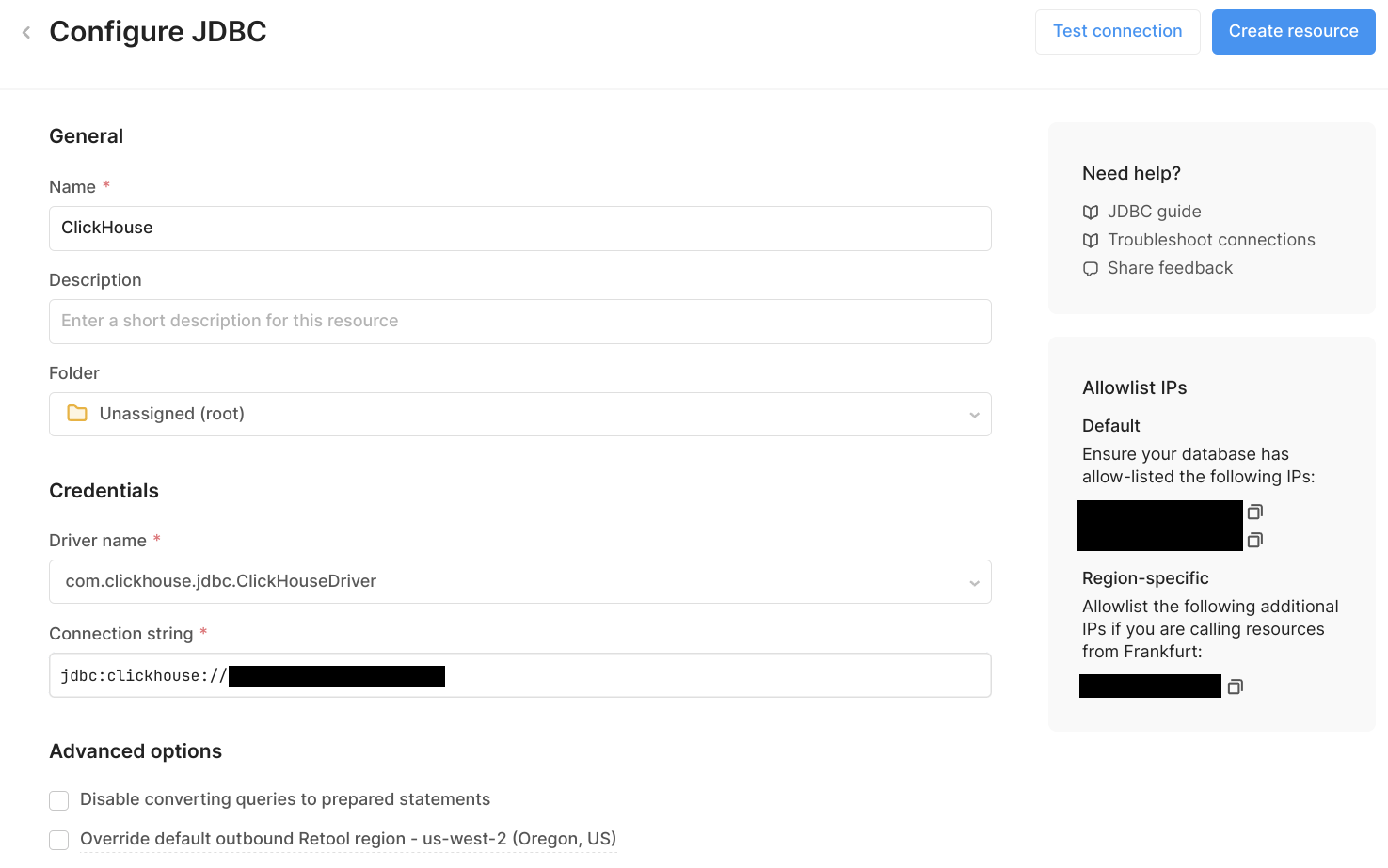 Заполните свои учетные данные ClickHouse в следующем формате: jdbc:clickhouse://HOST:PORT/DATABASE?user=USERNAME&password=PASSWORD.