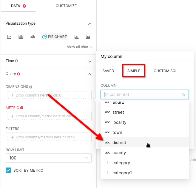 - Круговые диаграммы Superset требуют Dimension и Metric, остальные параметры являются необязательными. Вы можете выбрать свои собственные поля для измерения и метрики, в этом примере используется поле ClickHouse