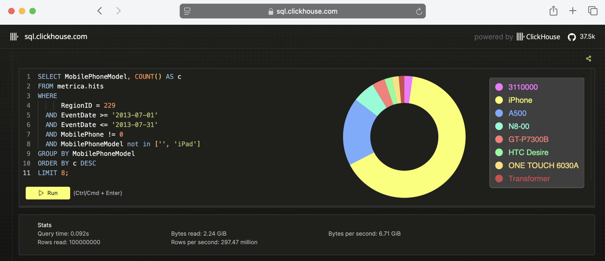 Вы можете выполнить этот запрос в ClickHouse SQL Playground, который выбирает и фильтрует всего несколько из более чем 100 существующих колонок, возвращая результат за миллисекунды: