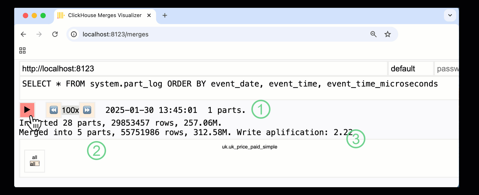 В ClickHouse 24.10 был добавлен новый приборная панель слияний в встроенные панели мониторинга. Доступная как в OSS, так и в Cloud через HTTP-обработчик /merges, мы можем использовать ее для визуализации всех слияний частей для нашей примерной таблицы: