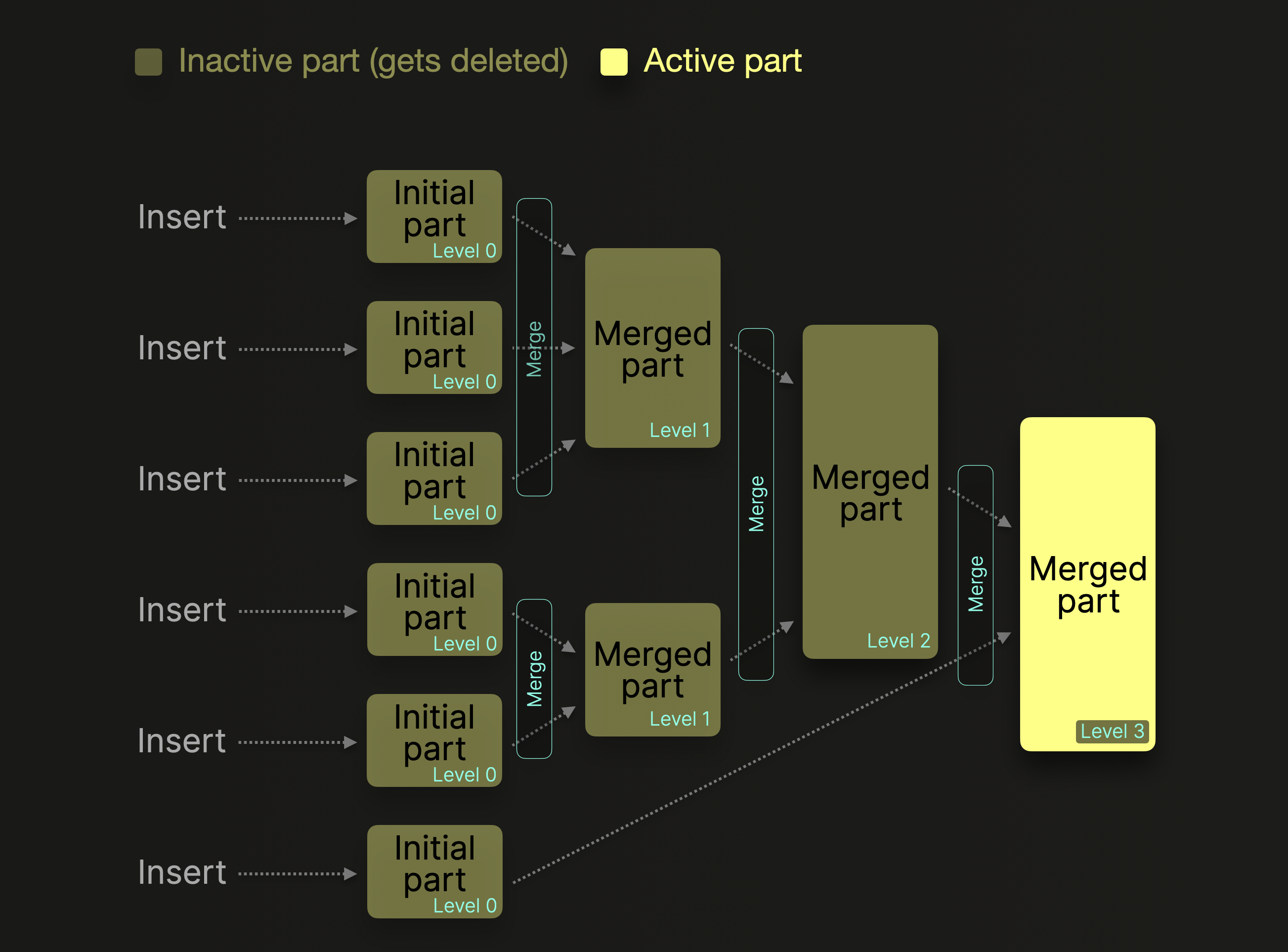 Уровень слияния части увеличивается на один с каждым дополнительным слиянием. Уровень 0 означает, что часть новая и еще не была слита. Части, которые были слиты в большие части, помечаются как неактивные и в конечном итоге удаляются после настраиваемого времени (по умолчанию 8 минут). С течением времени это создает дерево слитых частей. Поэтому название слияние деревьев таблицы.