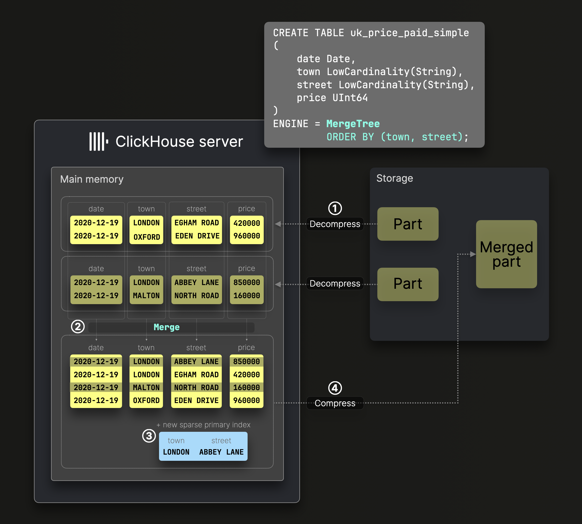 ① Декомпрессированные, предварительно отсортированные колонки таблицы ② сливаются с сохранением глобального порядка сортировки таблицы, определенного ключом сортировки таблицы, ③ создается новый разреженный первичный индекс, и ④ слитые файлы колонок и индекс сжимаются и сохраняются как новая часть данных на диске.