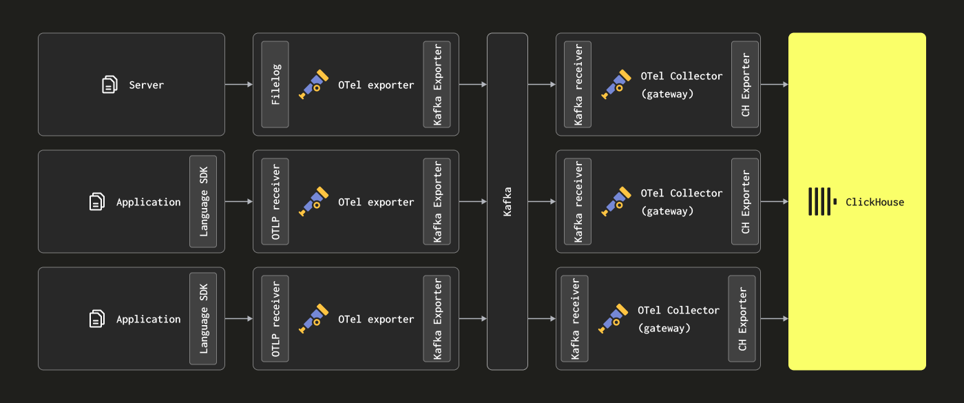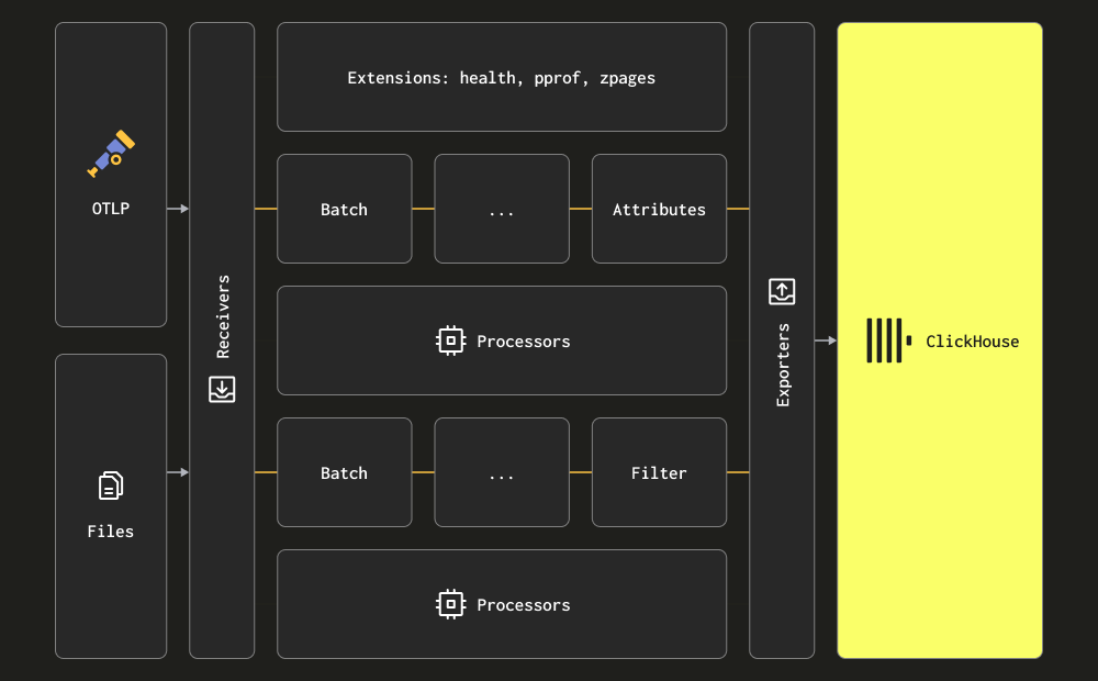 • The OpenTelemetry Collector is a proxy that receives, processes, and exports telemetry data. A ClickHouse-powered solution uses this component for both log collection and event processing prior to batching and inserting.