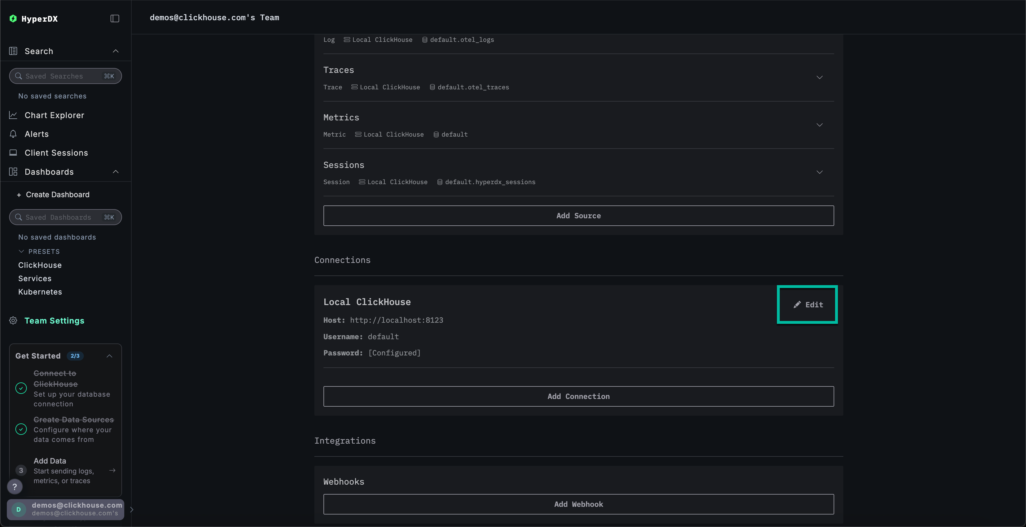 HyperDX will automatically connect to the local cluster and create data sources for the logs, traces, metrics, and sessions - allowing you to explore the product immediately.