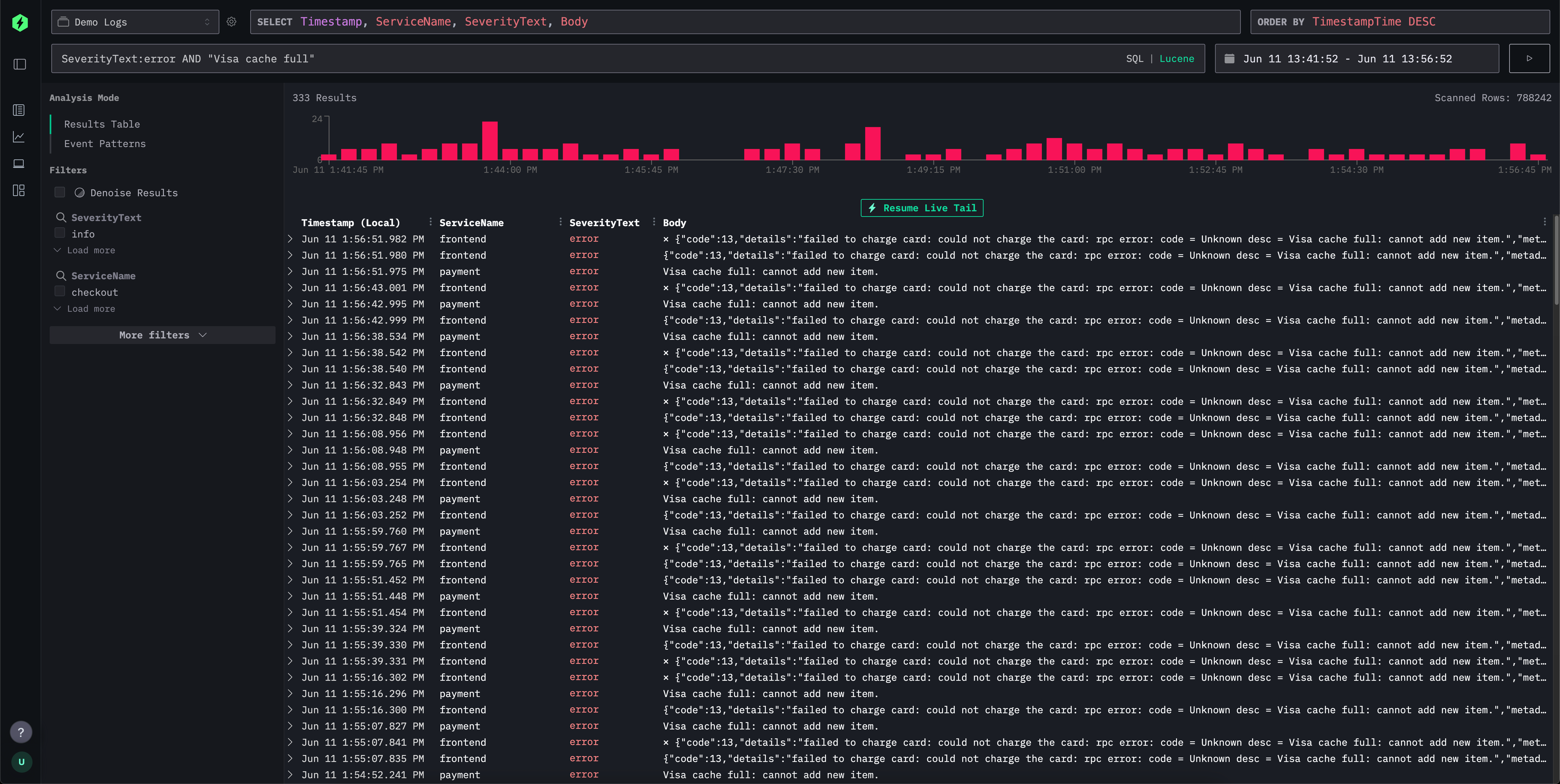 HyperDX's search interface supports this familiar syntax but translates it behind the scenes into efficient SQL WHERE clauses, making the experience familiar for Kibana users while still allowing users to leverage the power of SQL when needed. This allows users to exploit the full range of string search functions, similarity functions and date time functions in ClickHouse.