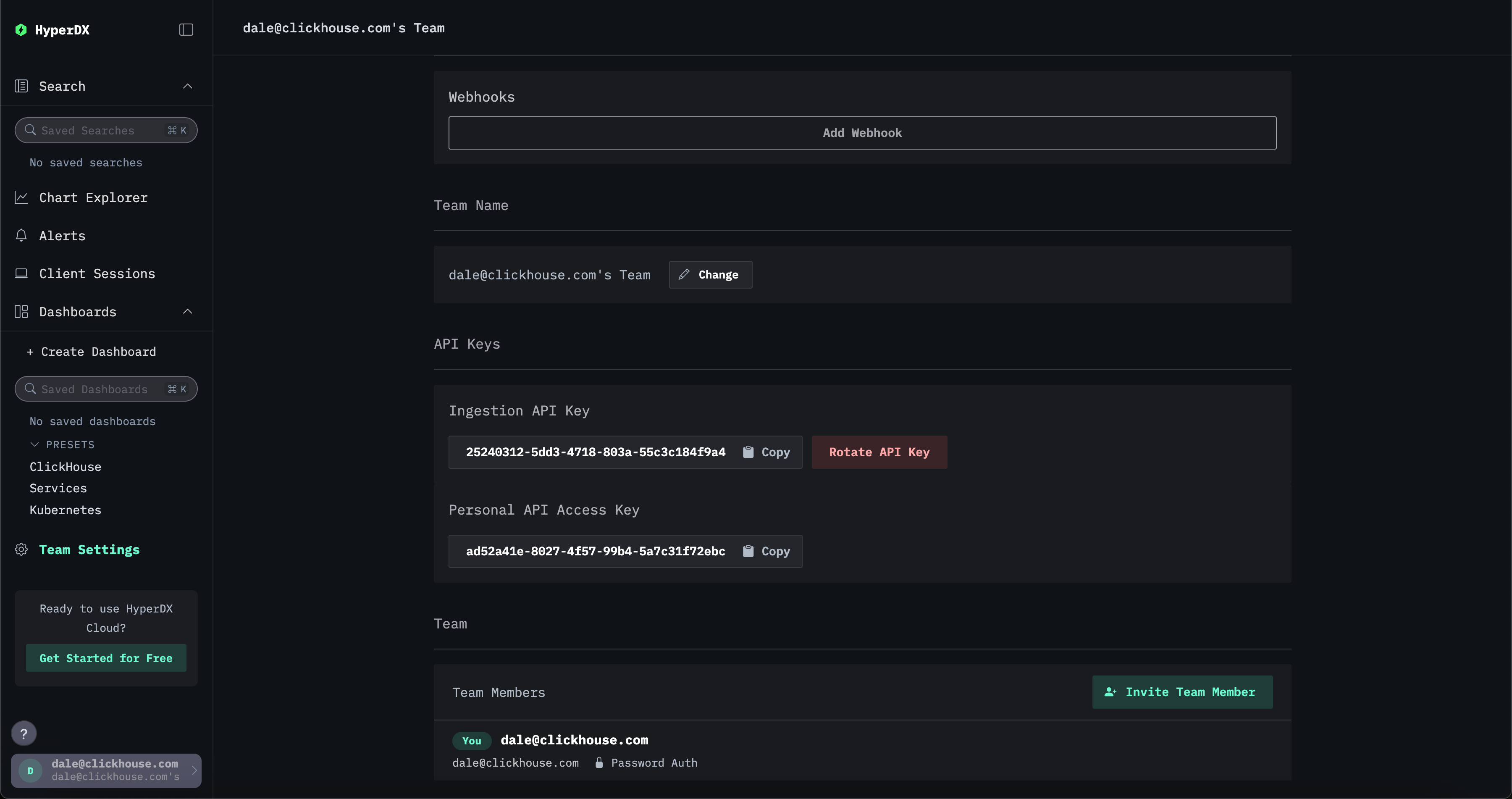 All ingestion should occur via the OTLP ports exposed by ClickStack distribution of the OpenTelemetry (OTel) collector. By default, this requires a secure ingestion API key generated at startup. This key is required when sending data to the OTel ports, and can be found in the HyperDX UI under Team Settings → API Keys.