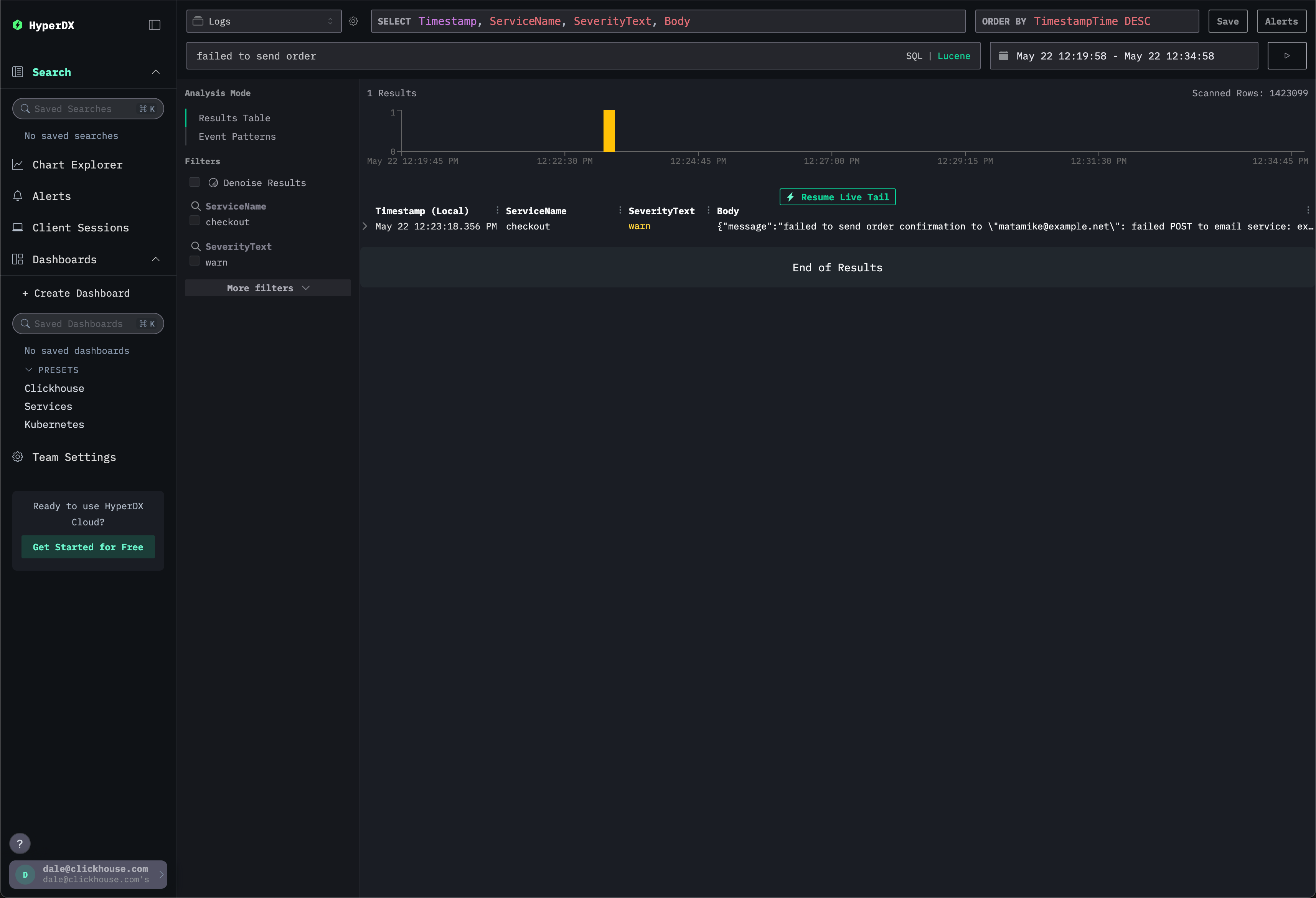 ClickStack allows you to do a full-text search on your events (logs and traces). You can get started searching by just typing keywords that match your events. For example, if your log contains "Error", you can find it by just typing in "Error" in the search bar.